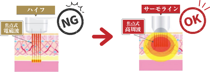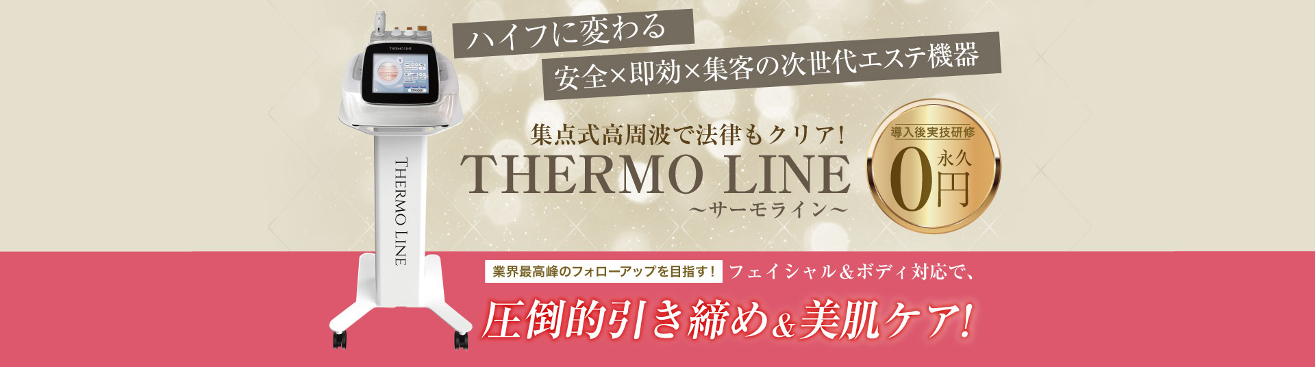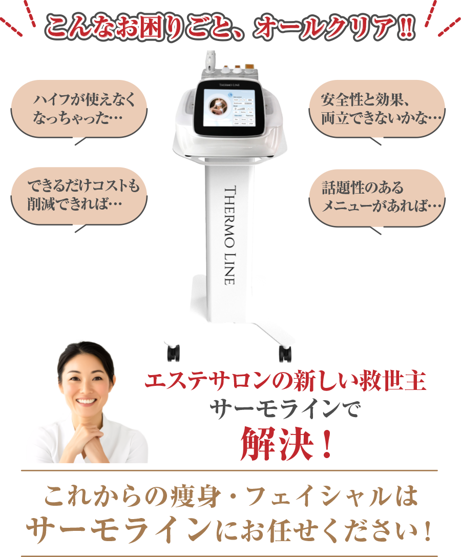 でも、ご安心ください。新技術を採用した「サーモライン」が登場しました。サーモラインなら、従来の焦点式超音波に代わり、焦点式高周波を使用することで法規制を遵守することが可能。これによって、お客様に安心してご提供できるボディケアやフェイシャルケアを実現し、引き続き幅広いメニューを展開することができます。