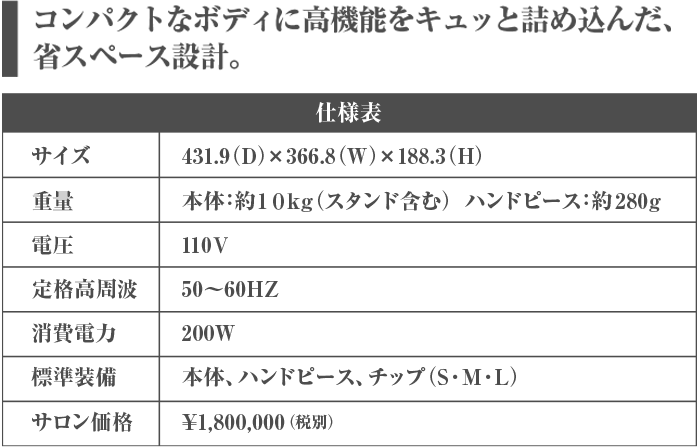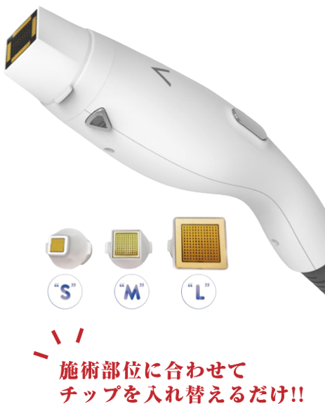 この1台で、フェイシャルやボディケアなど、さまざまな施術に対応。専用チップを交換すれば、多様なニーズにもお応えできます。