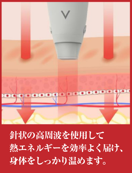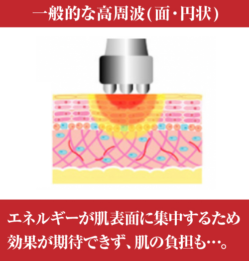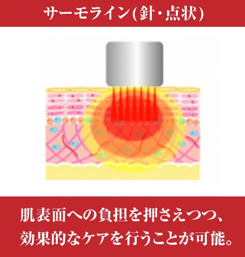 さらにサーモラインは、面・円上に作用する一般的な高周波に対して針・点状に作用するため、エネルギーが広範囲にわたって均等に分散し、複数のポイントで熱を発生させます。これによって、肌への負担を軽減しながら効果的なアプローチを実現します。